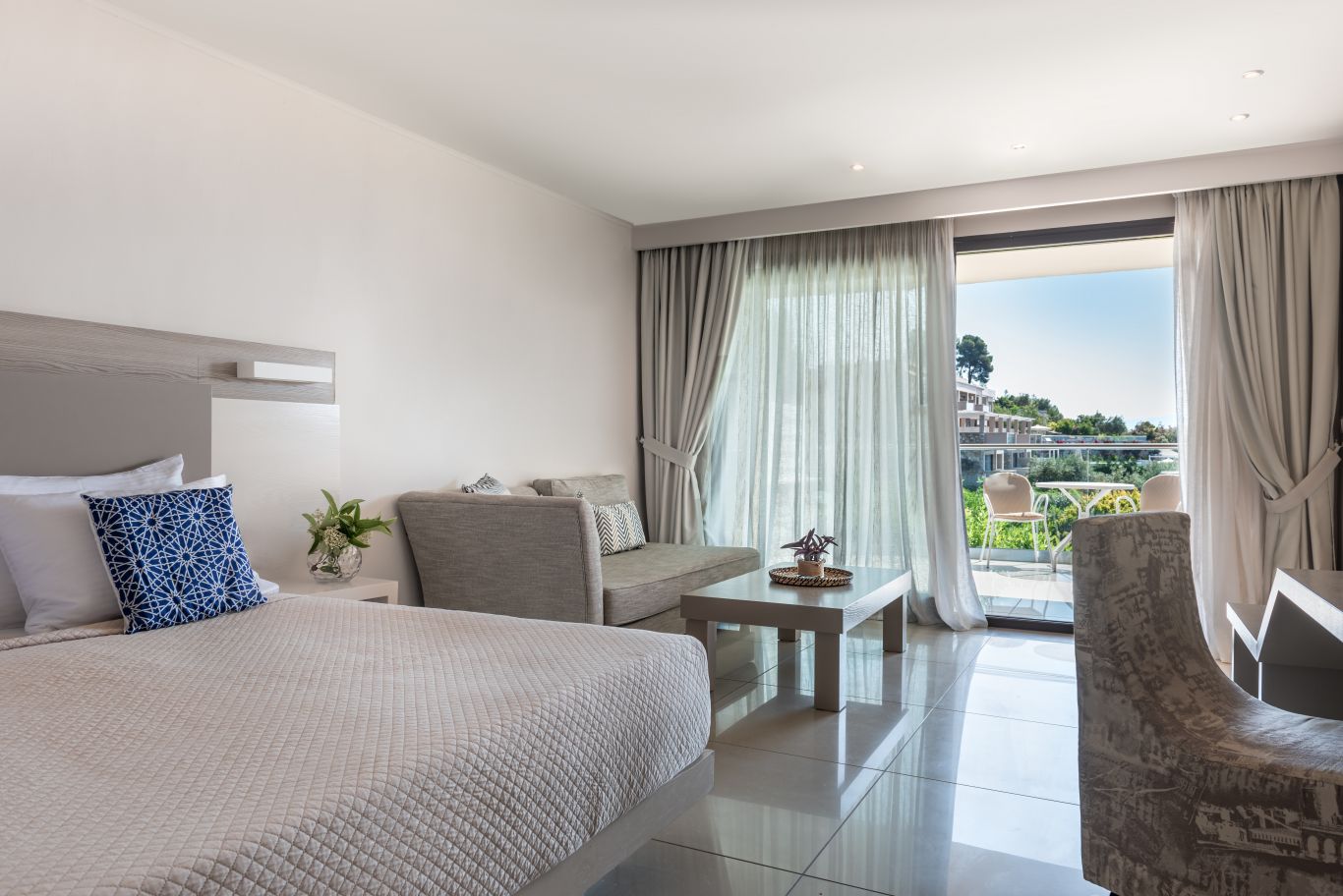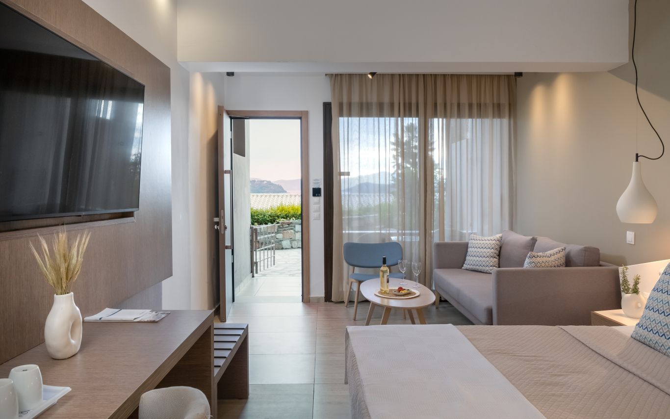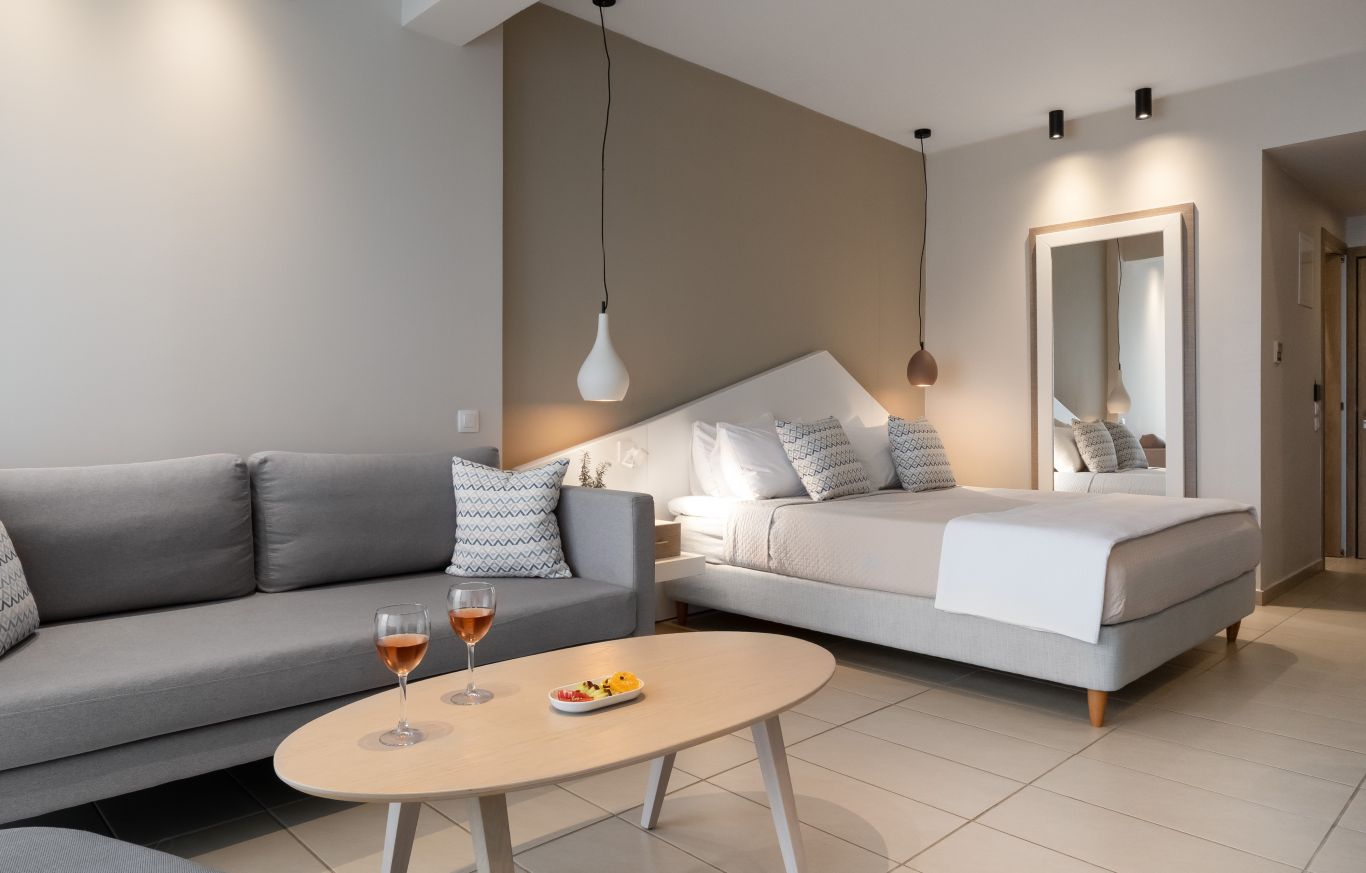 Open-plan room that combines a sleeping area with double bed and a sitting space. The rooms are located either on the ground floor or on floor and offer private terrace or balcony with inland view or sea view.