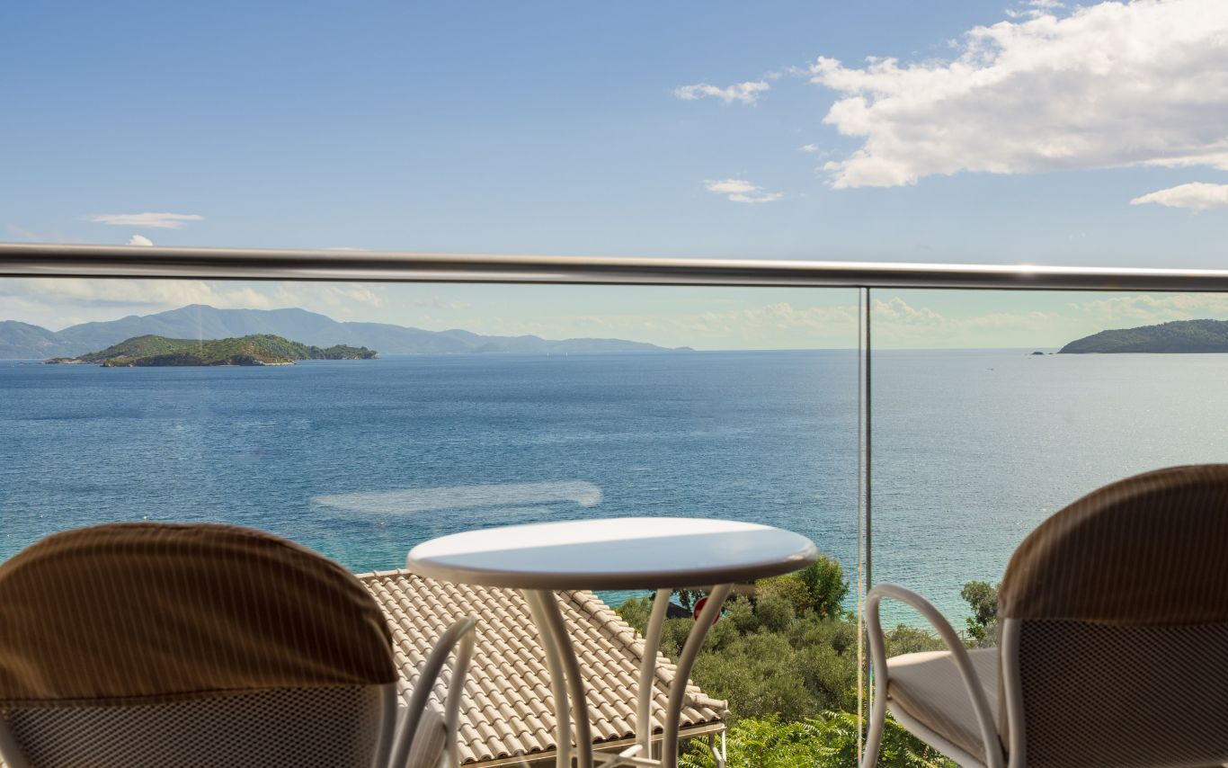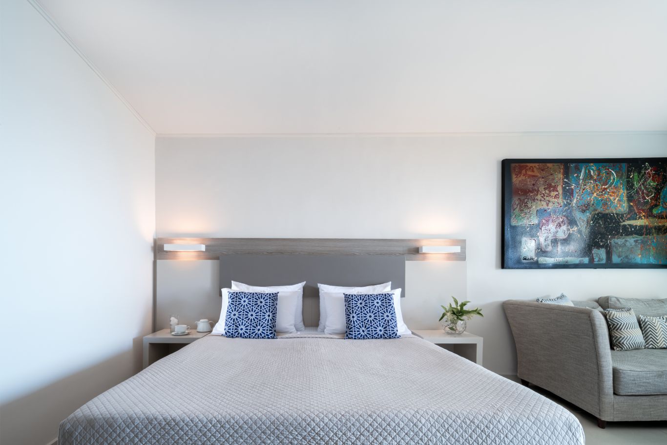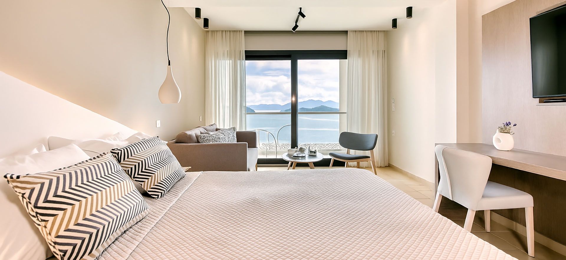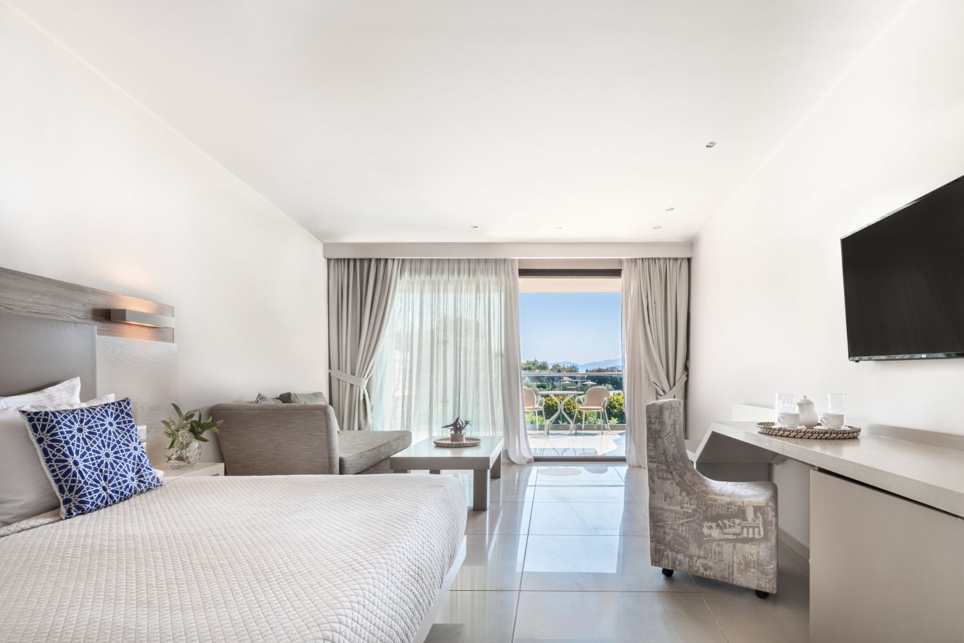 Open-plan room that combines a sleeping area with double bed and a sitting space. The rooms are located either on the ground floor or on floor and offer private terrace or balcony with inland view or sea view.